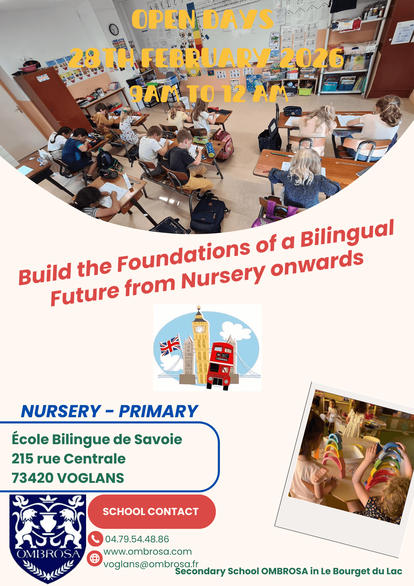 The Open Day for Nursery and Primary in OMBROSA Savoie will take place on Saturday the 28th of February from 9am to 12am in Voglans (215 rue Centrale).