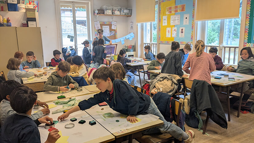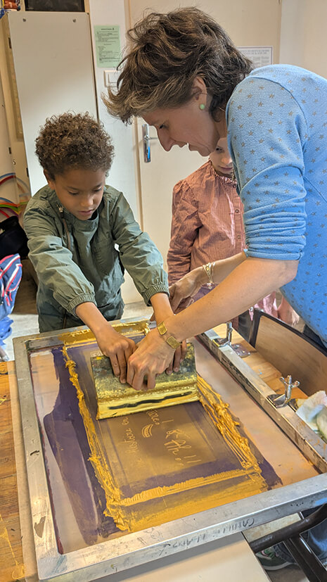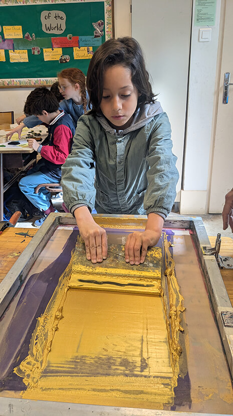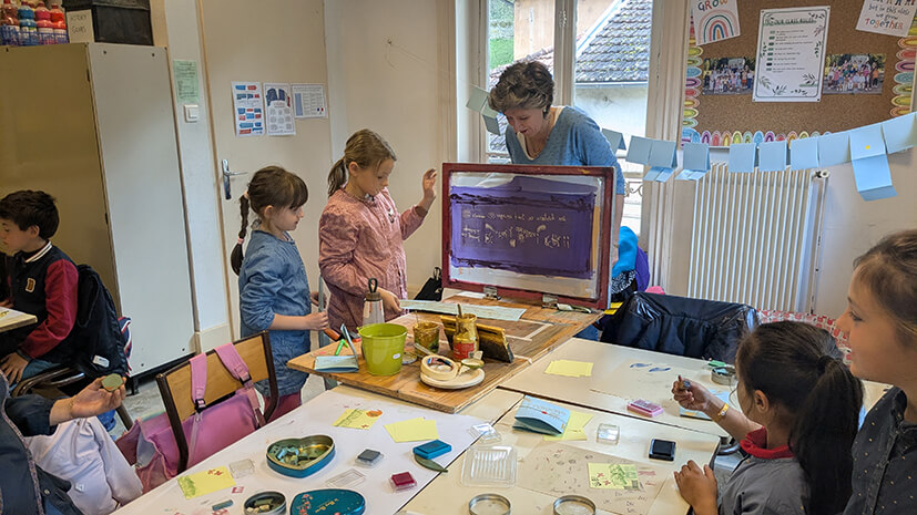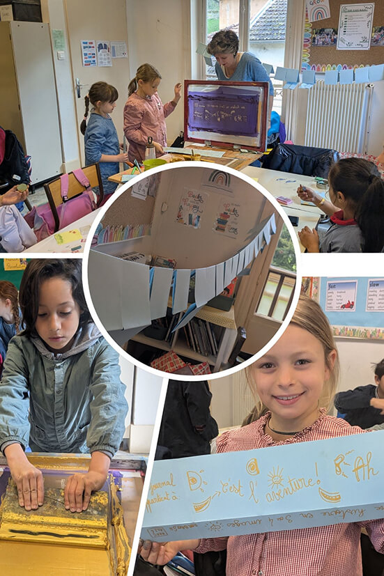 In connection with the work on the evolution of writing over time, the students imagined a story in four images using stamps and discovered the screen printing technique. A wonderful moment of creation and discovery!